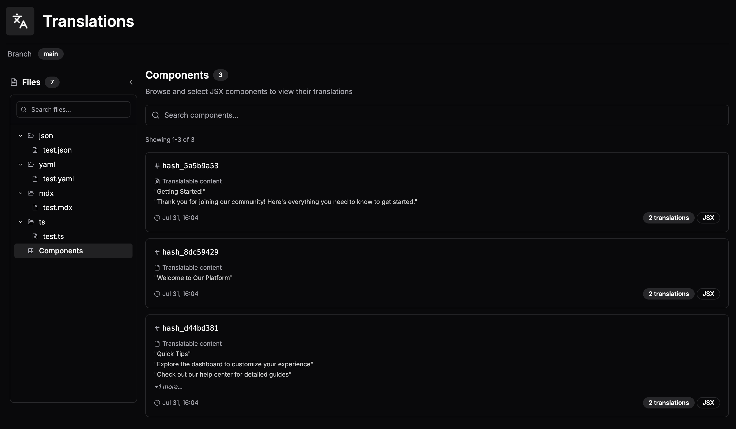 For projects using JSX or component-based content (like React apps), the Translations page shows a Components view instead of a file tree.