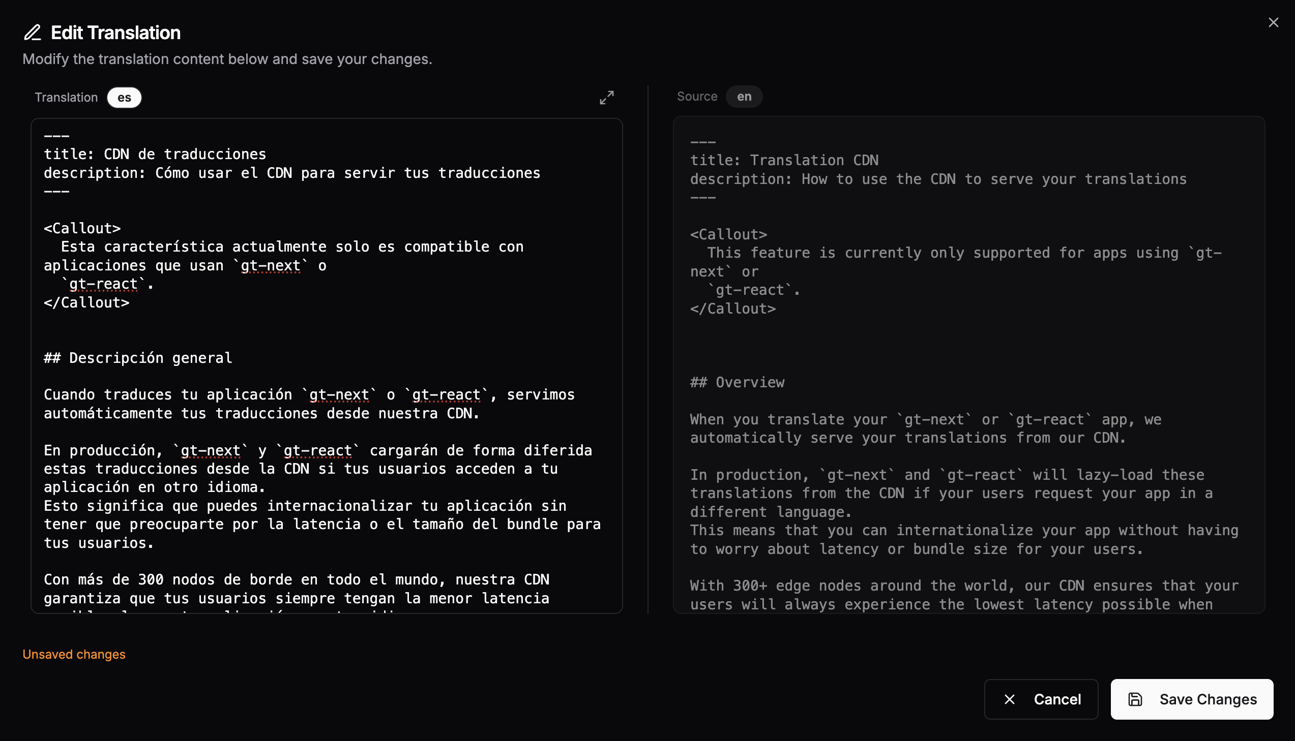 Click Edit on any file to modify the translation content. The editor opens as a modal with two panels: