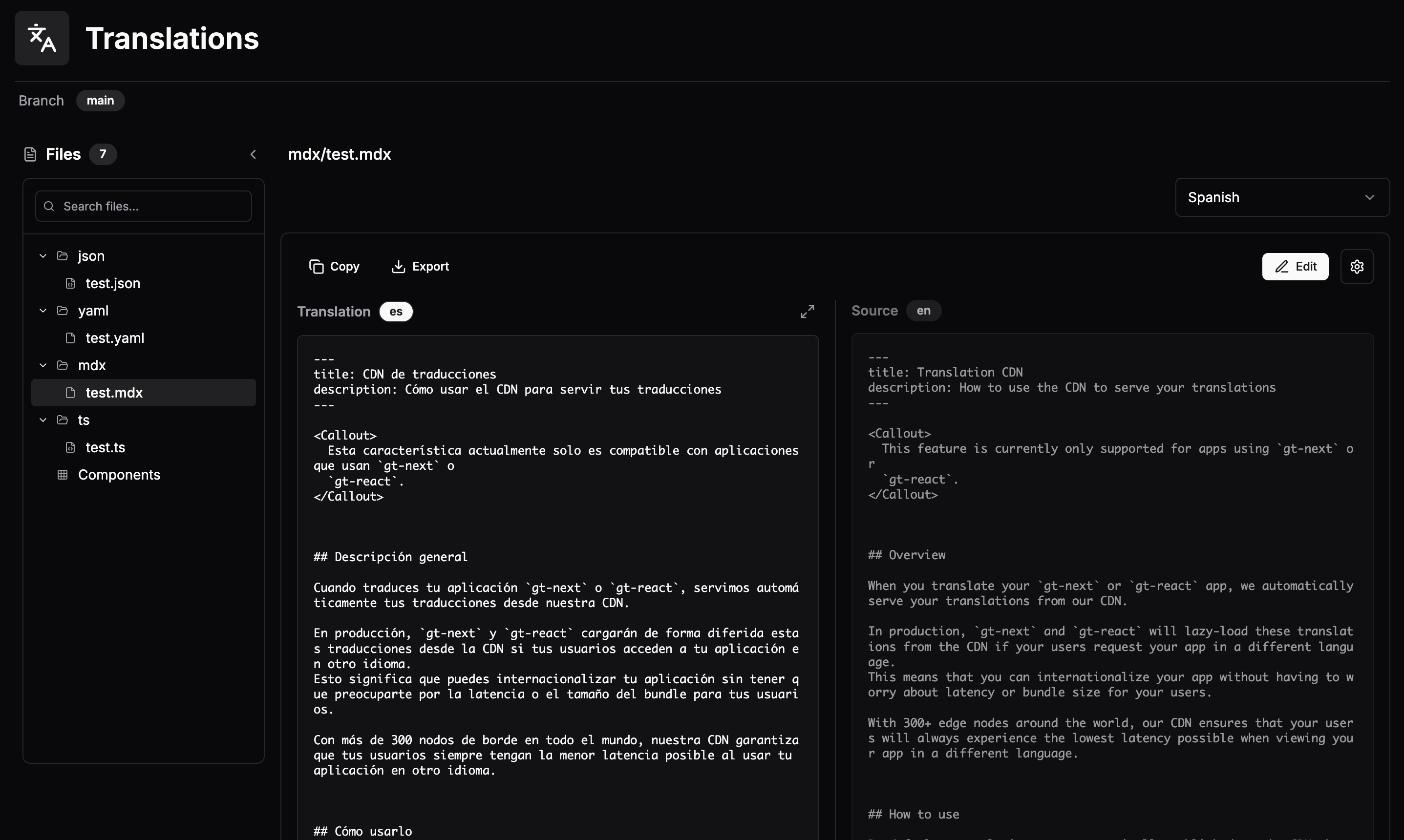 The Translations page is where you manage all translated content for your project. Browse files, view translations alongside source content, and edit them directly.