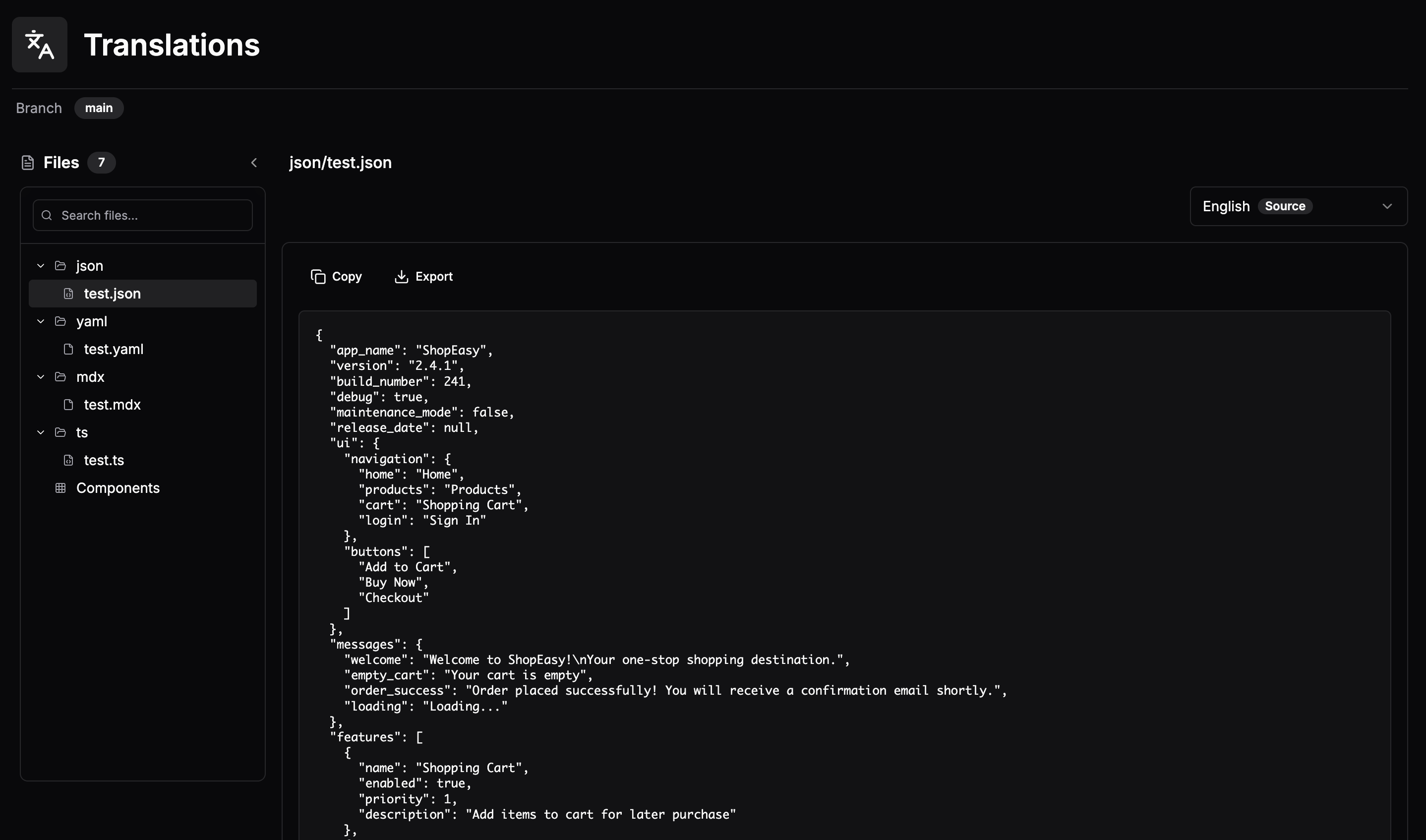 When you open Translations, you'll see a file tree on the left showing all translatable content in your project.